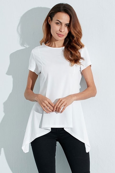 ОписаниеБелая туника с короткими рукавами, вытачками иудлиненным сзади подолом. Отличный вариант для жаркого лета!